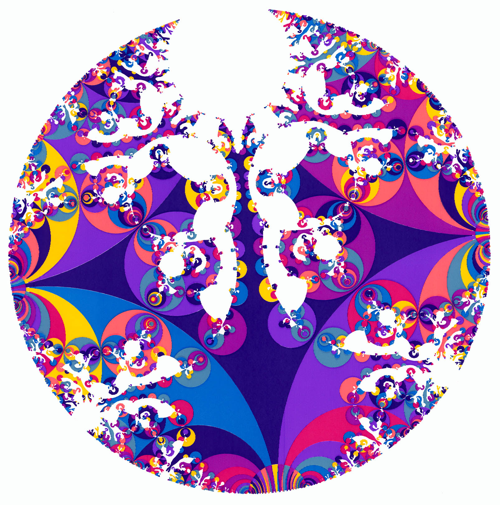 ![Fig. 2c. The horizon at infinity of the Poincaré half-space H3. A spacelike slice (F,Γ) is realized in H3 as a polyhedron F with face-identification. The face-pairing transformations generate a discrete group Γ which gives, if applied to the polyhedron, a tessellation Γ(F) of H3 with polyhedral images. This tessellation induces by continuity a tiling on the boundary of H3 which is depicted here. The qualitative structure of the fractal limit set Λ(Γ) depends on the topology of the 3-slices, which is in turn determined by the covering group. For quasi-Fuchsian groups [26] like here, the limit set is a Jordan curve (not self-similar). In all three examples, the 3-space fibers over an open interval, with Riemann surfaces (g = 19) as fibers. The depicted tilings correspond to 3-slices which are globally non-isometric, but have the same topology and curvature. They make deformations as schematized in Fig. 1(a–c) quantitative. For example, the polyhedral tiling of H3 is obtained by placing hemispheres onto the circular arcs. The colors label generations in the tiling procedure [34]. The chaotic trajectories in the 3-space have covering trajectories with initial and terminal points in Λ(Γ). If the end points are not in Λ(Γ) but close to it, then the trajectory is regular, but it can shadow a chaotic trajectory over a long time. The convex hull C(Λ) of Λ(Γ) is the intersection of all hyperbolic half-spaces which contain Λ(Γ). Projected into (F,Γ), it constitutes the center C(Λ)\Γ of the 3-space, see Ref. [29] for an explicit example of this projection.](FIG_tachyonic_chaos_causality_open_universe/Fig2c-25.jpg)