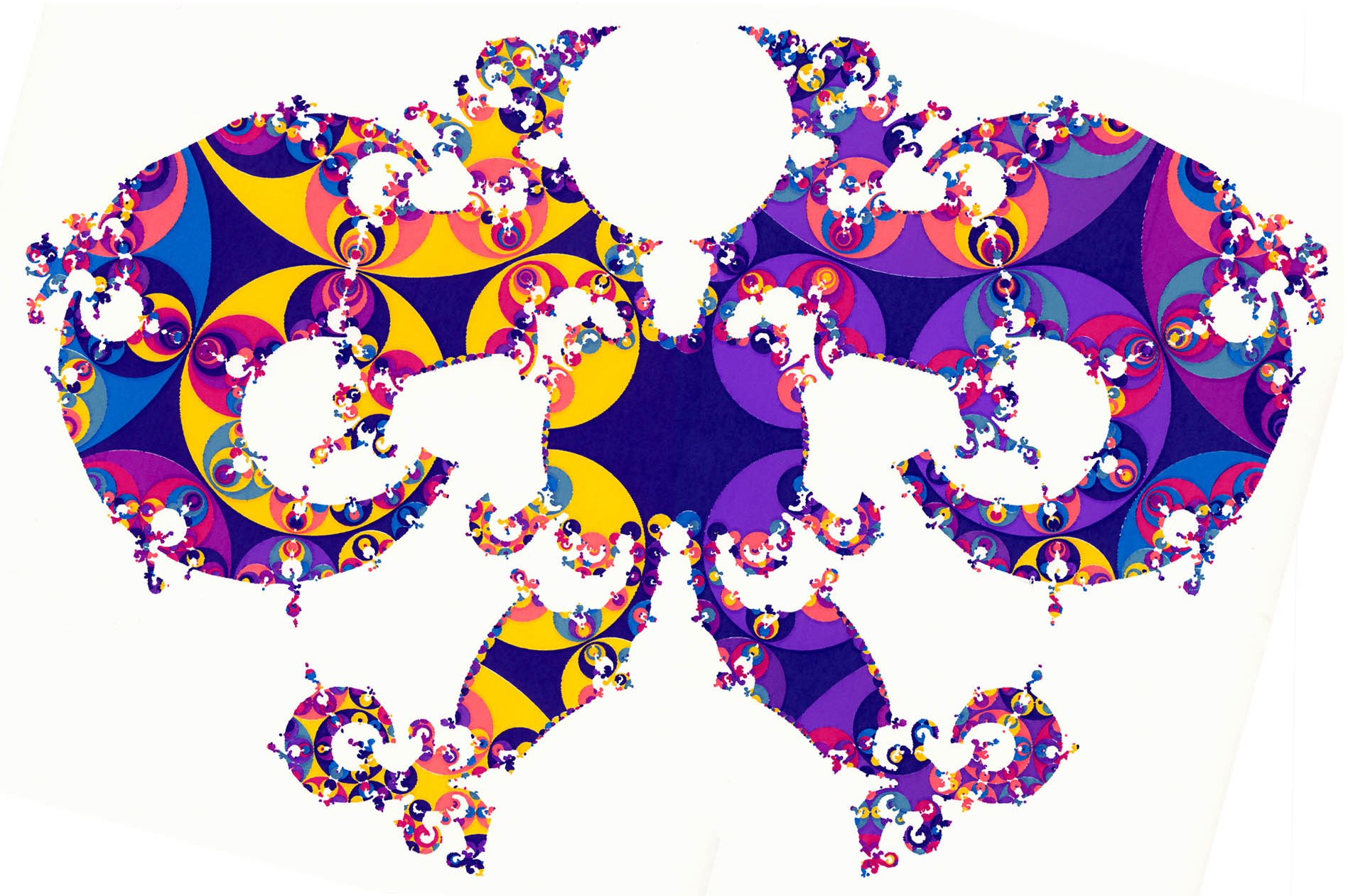 ![Fig. 2a. The horizon at infinity of the Poincaré half-space H3. A spacelike slice (F,Γ) is realized in H3 as a polyhedron F with face-identification. The face-pairing transformations generate a discrete group Γ which gives, if applied to the polyhedron, a tessellation Γ(F) of H3 with polyhedral images. This tessellation induces by continuity a tiling on the boundary of H3 which is depicted here. The qualitative structure of the fractal limit set Λ(Γ) depends on the topology of the 3-slices, which is in turn determined by the covering group. For quasi-Fuchsian groups [26] like here, the limit set is a Jordan curve (not self-similar). In all three examples, the 3-space fibers over an open interval, with Riemann surfaces (g = 19) as fibers. The depicted tilings correspond to 3-slices which are globally non-isometric, but have the same topology and curvature. They make deformations as schematized in Fig. 1(a–c) quantitative. For example, the polyhedral tiling of H3 is obtained by placing hemispheres onto the circular arcs. The colors label generations in the tiling procedure [34]. The chaotic trajectories in the 3-space have covering trajectories with initial and terminal points in Λ(Γ). If the end points are not in Λ(Γ) but close to it, then the trajectory is regular, but it can shadow a chaotic trajectory over a long time. The convex hull C(Λ) of Λ(Γ) is the intersection of all hyperbolic half-spaces which contain Λ(Γ). Projected into (F,Γ), it constitutes the center C(Λ)\Γ of the 3-space, see Ref. [29] for an explicit example of this projection.](FIG_tachyonic_chaos_causality_open_universe/Fig2a-25.jpg)
